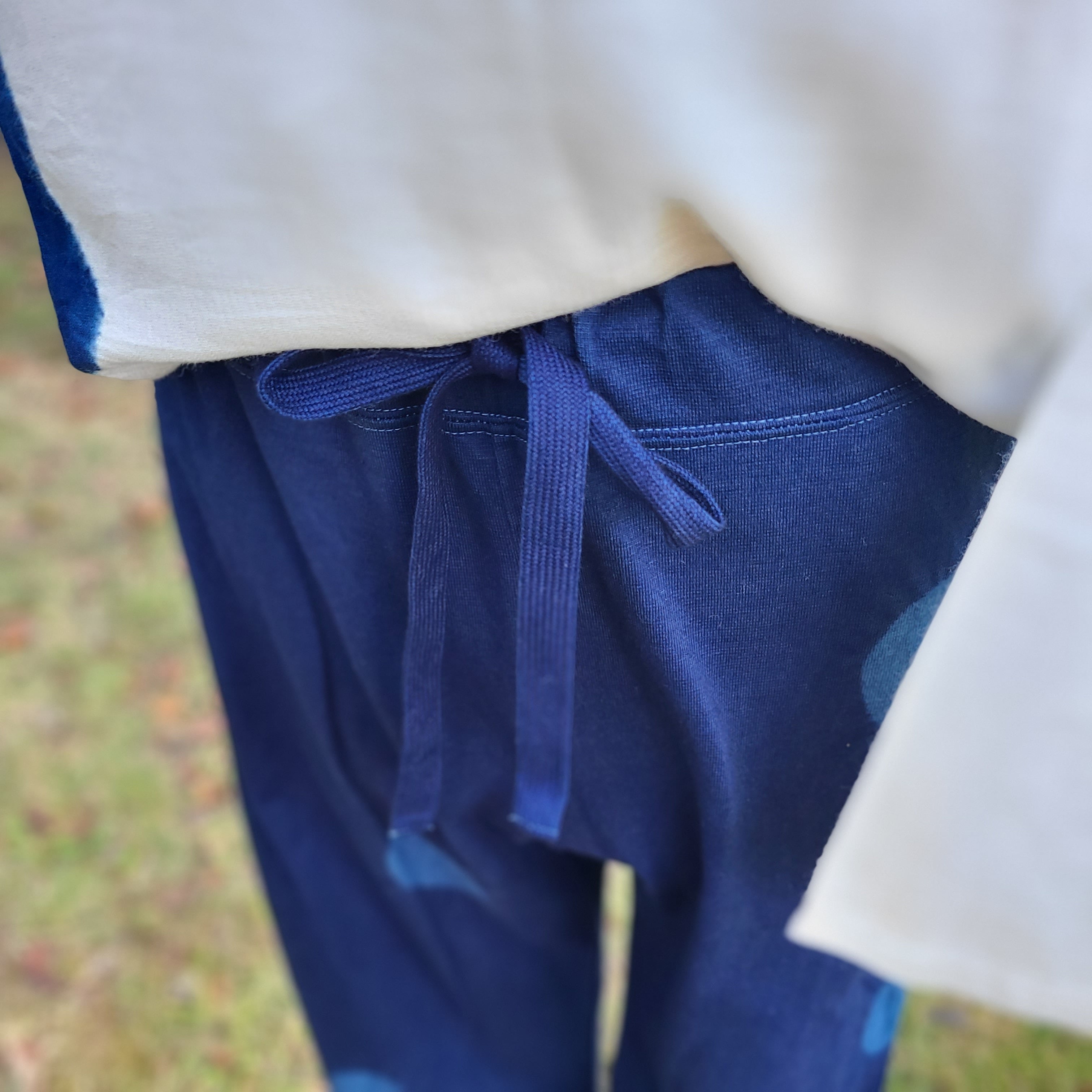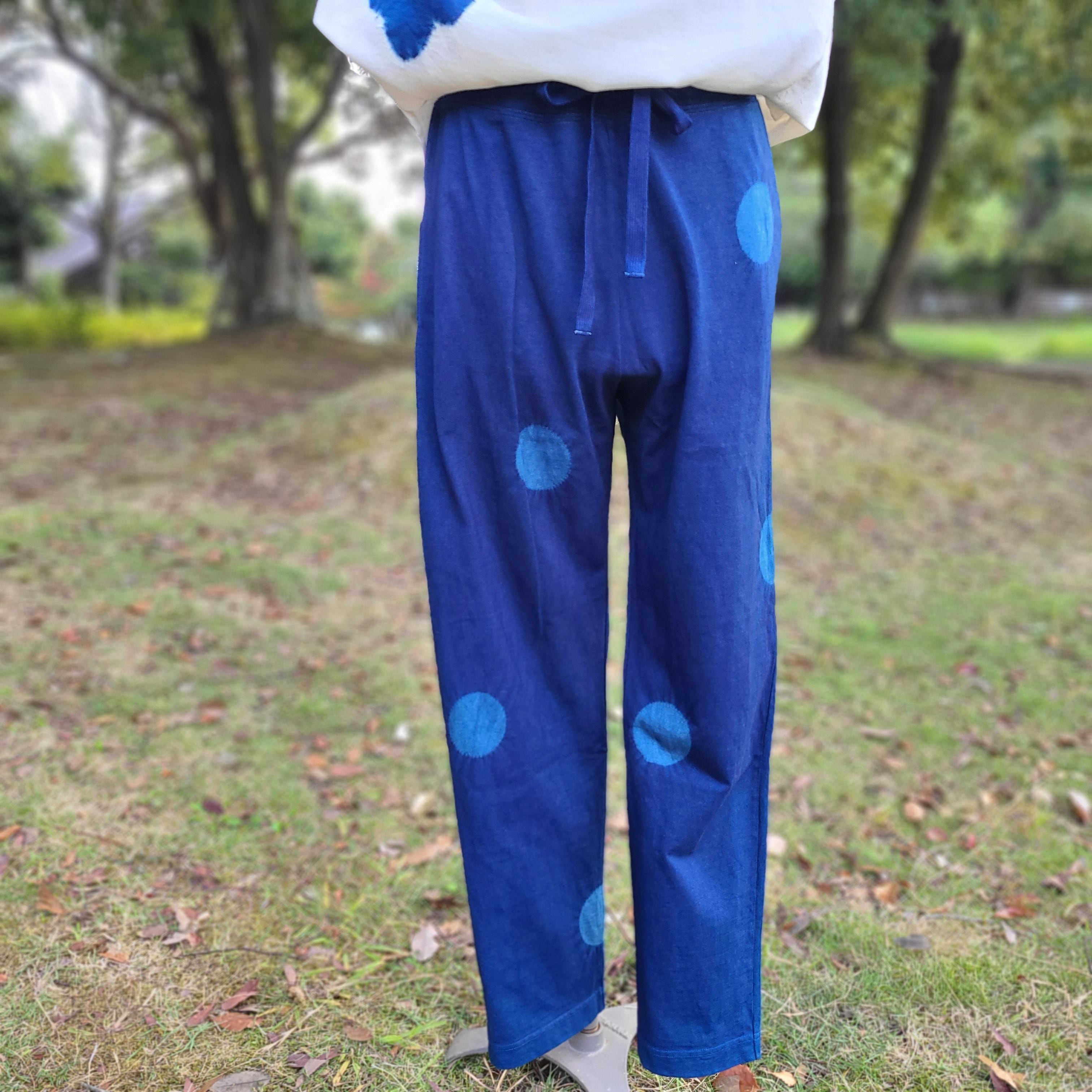 オーガニックコットン ヤクパンツ『紺ベース青丸』 Organic Cotton Yak Pants 'Dark Blue Base Blue Dots' | 琉球藍染工房 ウメノコヤ umenokoya