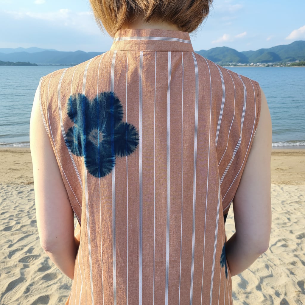 b319 比翼ノースリーブワンピース 紺花 Fly Front Sleeveless One Piece Dress 'Indigo Flowers' | 琉球藍染工房 ウメノコヤ umenokoya